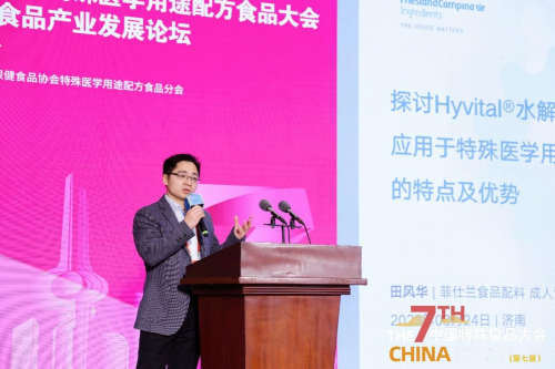 近年来,消费者更倾向于将添加更多“好成分”的营养品或补充剂融入日常饮食。水解蛋白作为蛋白质及氨基酸强化剂被广泛应用于营养保健品中。在大会下设的特医食品产业发展分论坛上,菲仕兰食品配料成人营养市场总监田风华分享了Hyvital ®水解蛋白应用于特医食品的特点及优势。在营养益处上,水解蛋白可以帮助改善蛋白能量营养不良,帮助肌肉修复和构建,还能改善酪蛋白磷酸肽等矿物质的吸收。在生理益处上,水解蛋白相比于整蛋白和游离氨基酸可以更快被人体吸收,还能改善喂养耐受性、减少过敏发生。得益于水解蛋白的独特优势,其被特医食品用于降低体系粘度,改善风味口感,实现更好的饮用性与更好的味型。